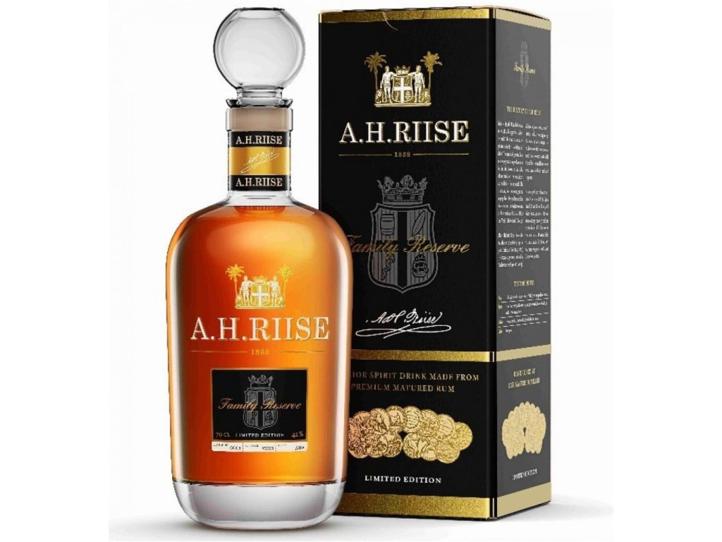 A.H. Riise Family Reserve je nejkvalitnějším a nejexkluzivnějším rumem lékárníka Riise s průměrnou dobou zrání 25 let. Ročně se naplní pouze 3000 lahví tohoto jedinečného rumu, který je vybírán z nekvalitnějších sudů „Masterem Distillerem“ a následně uchováván podle „metody Solera“. A.H. Riise Family Reserve rum má svěží temně mahagonovou barvu s lahodným aroma pomeranče, melasy a exotického ovoce. Jeho chuť je silná a velmi bohatá s nádechem pomeranče, přírodního cukru a tabá-ku, která je zakončena kořeněným ale přesto smetanovým a sladkým závěrem. Tento rum je silný, ale přesto delikátní. Původně byl rum určen pouze pro rodinu lékárníka Riise and díky tomu se s ním veřejně neobchodovalo. A tak je nám velkou ctí, že nyní můžeme nabídnout tento rum světové úrovně znalcům kvalitního alkoholu a jiným významným osobnostem. |