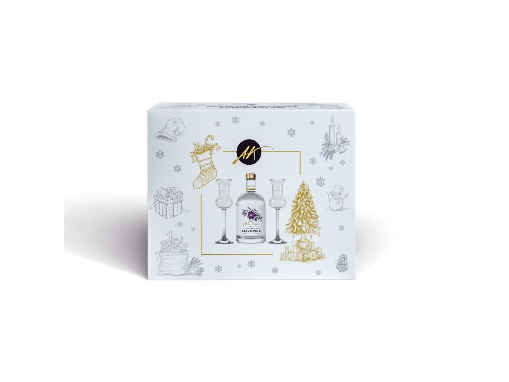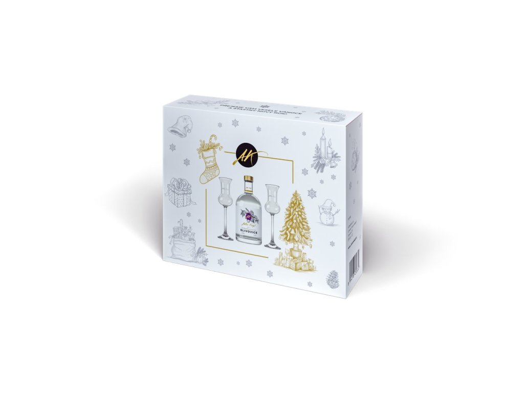 Vánoční luxusní dárková balení tzv. klapboxy z tvrdého papíru tloušťky 1,4 mm s ofsetovým barevným tiskem, matnou laminací a s pěnovou výstelkou naplněné lahví našeho kvalitního destilátu a degustačními skleničkami z českého skla.