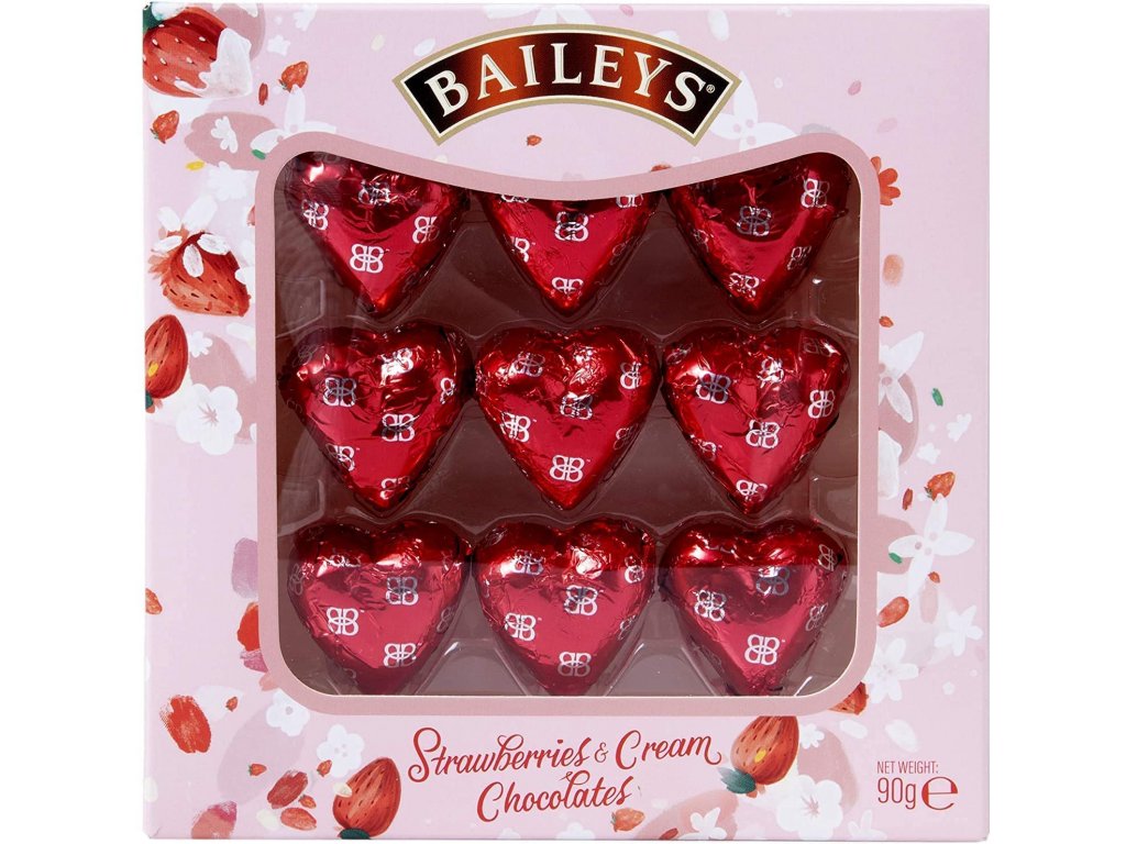 Luxusní čokoládové pralinky s náplní z oblíbeného likéru Baileys s příchutí jahod a smetany ve tvaru srdíček v dárkovém balení.