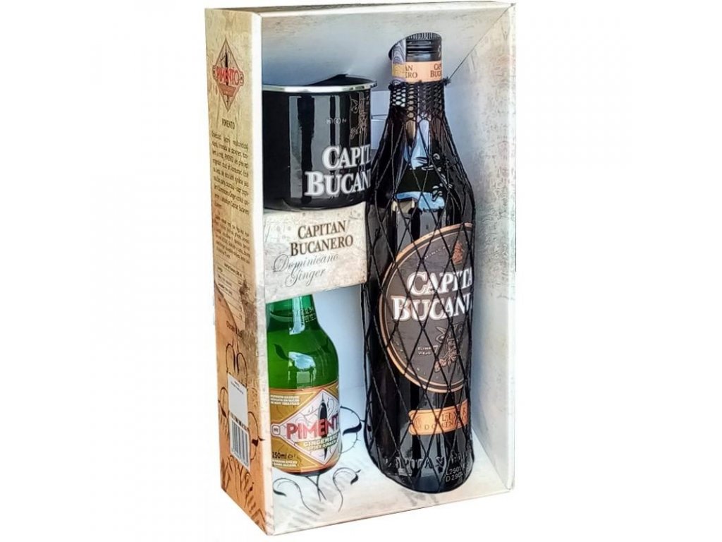 Dokonale sladký rumový nápoj medově jemné konzistence a chuť s tóny sušeného ovoce a karamelu a dlouhým finišem. Rum je destilován z té nejkvalitnější dominikánské třtiny a poté odpočívá v sudech. Vychutnejte si tuhle sladkou neřest jen tak při pokojové teplotě, nebo ji důkladně nachlaďte. Slušet jí to bude i v koktejlech. Vydejte se na plavbu po Karibiku s ostříleným kapitánem. Sladké nicnedělání, slunné pláže, jemný vánek ve vlasech. Přesně takovou scenérii vám navodí Capitan Bucanero Elixir Dominicano. I když tahle lahůdka obsahuje perfektně vyladěnou směs až sedmiletých dominikánských rumů, není to rum. Podle pravidel se tak totiž smí označovat pouze lahůdky s obsahem cukru pod 20 gramů na litr. Elixir je kromě rumů nabitý i parádní směsí sušeného ovoce a proto se pro něj používá výraz rumový likér nebo punč.Nyní v sadě se zázvorovou limonádou Pimento.