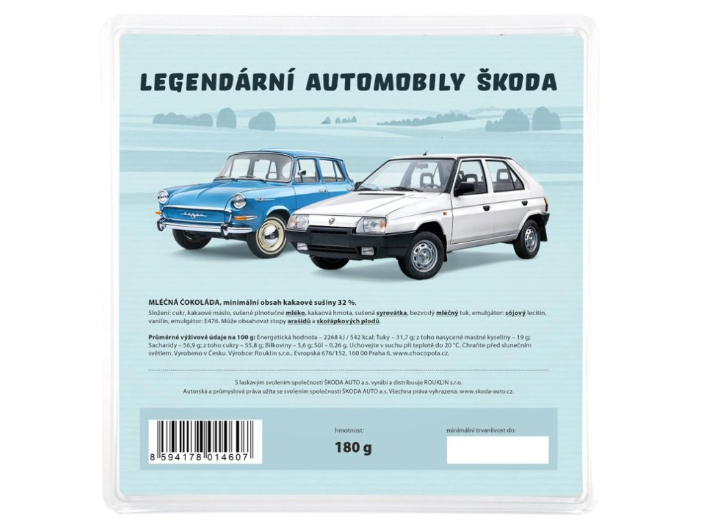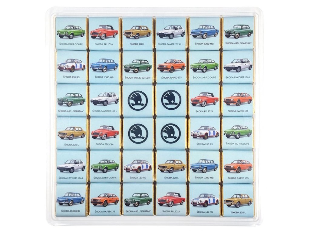 Mix 36 motivů lahodných mléčných mini čokolád pro milovníky legendárních vozidel značky Škoda od českého výrobce Chocopola. Baleno v průhledném blistru.