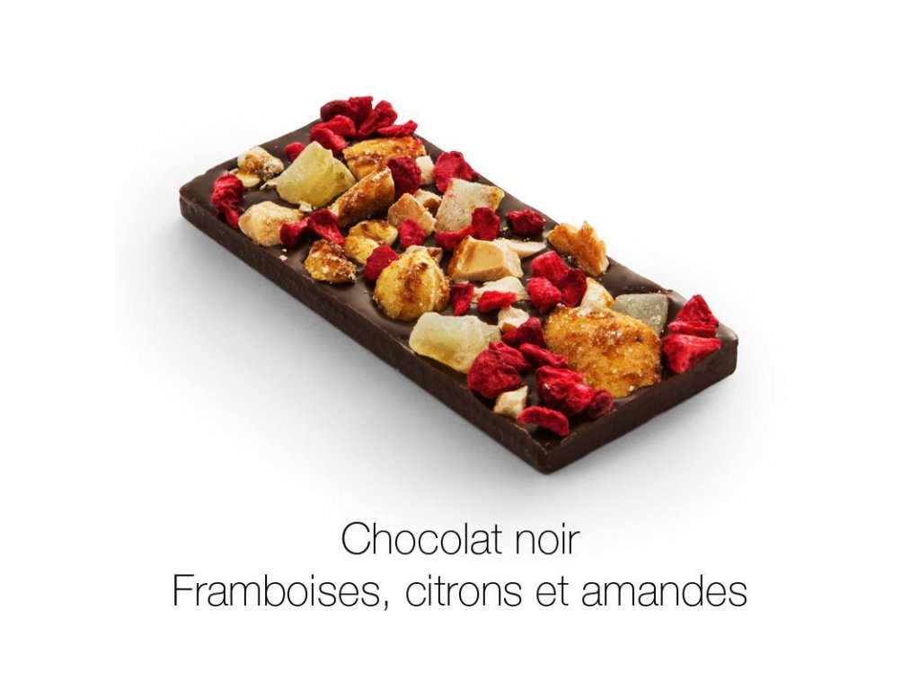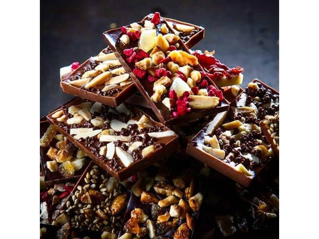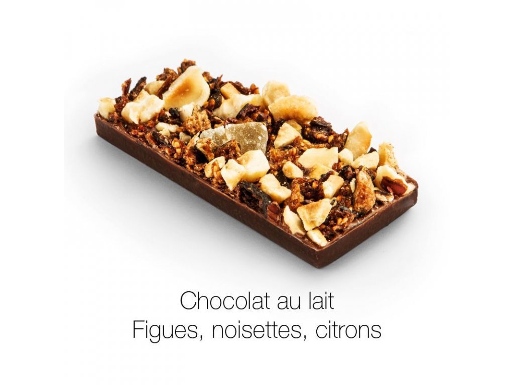 Složení: kakaová hmota, cukr, kakaové máslo, mandle, sušené plnotučné mléko, lískové oříšky, kandované kousky citrńu (cukr, citron, glukózový sirup), kousky karamelu (cukr, máslo, plnotučné sušené mléko, sušené nízkotučné mléko, sůl), fíky, brusinky a jahody, cereálie (rýžová mouka, pšeničný lepek, pšeničný slad, sacharóza, sůl, dextróza), pistácie, kousky malin, glukózový sirup, leštící látka šelak, emulgátor: řepkový lecitin, leštící látka: arabská guma, sacharóza, glukózový sirup) Bourbon vanilka. Může obsahovat stopy lepku a vajec.